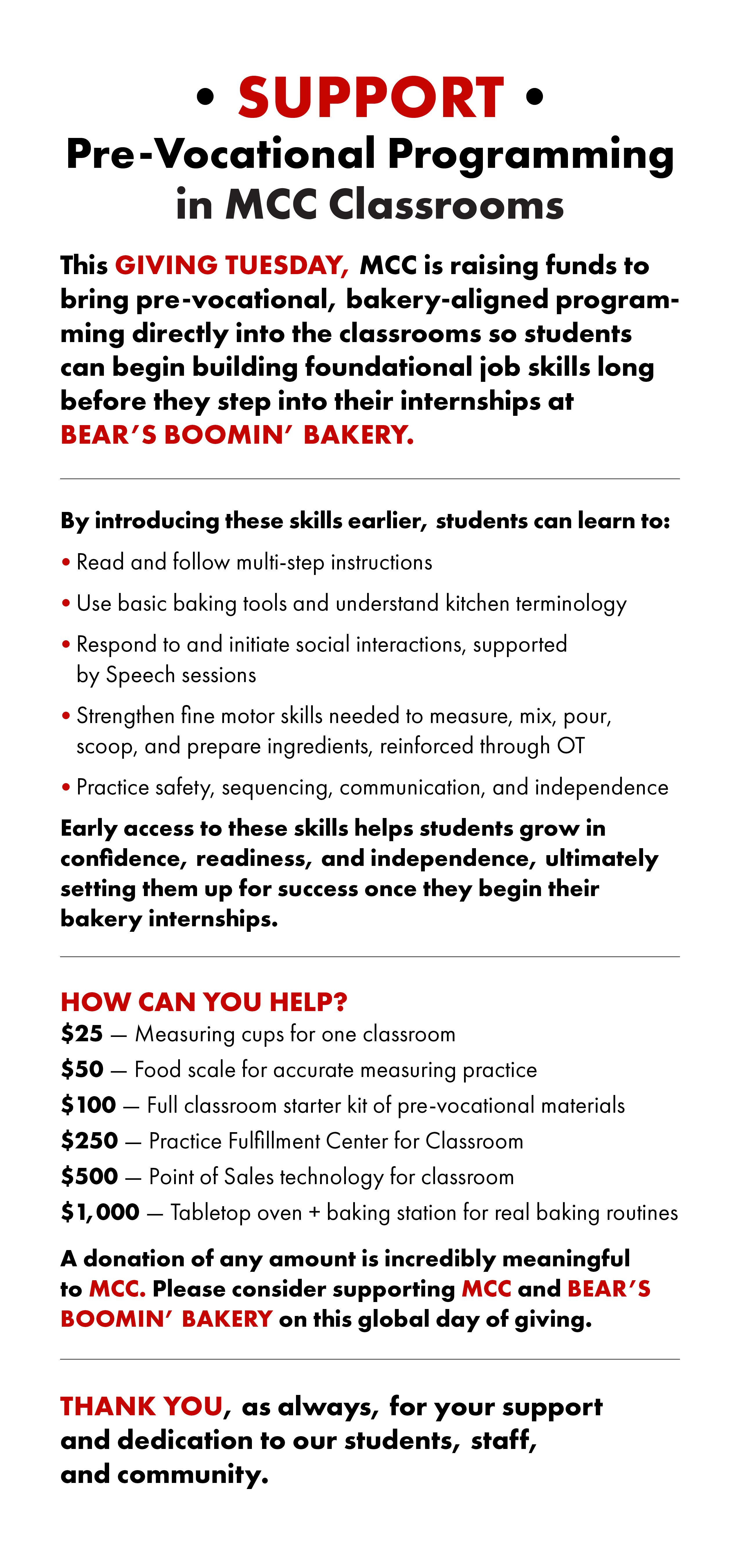 Support MCC and Bear's Boomin' Bakery this Giving Tuesday!